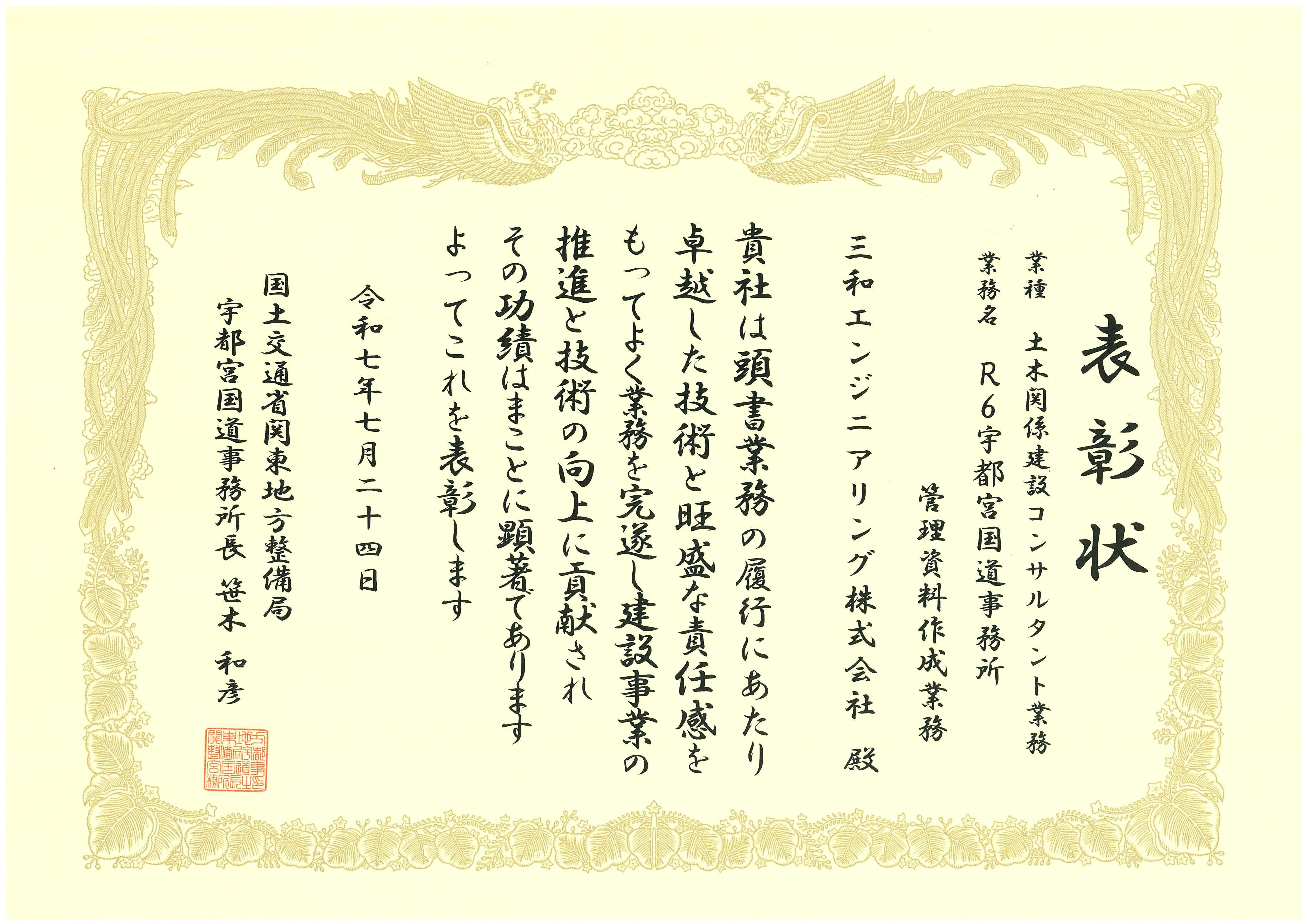 | 表彰業務 | R6宇都宮国道事務所管理資料作成業務(事務所長表彰) R6D相武国道事務所管内調査設計資料作成業務(事務所長表彰) 常総国道事務所 常総国道工事監督支援業務3J2(優良業務) 常総国道事務所 常総国道工事監督支援業務3J2(優秀技術者) 常総国道事務所 常総国道工事監督支援業務31J1(優良業務) 常総国道事務所 常総国道工事監督支援業務31J1(優秀技術者) 千葉国道事務所 千葉国道工事監督支援業務26M4 宇都宮国道事務所 H27宇都宮国道事務所管理資料作成業務 川崎国道事務所 H26年度川崎国道事務所調査設計資料作成業務(その3) |